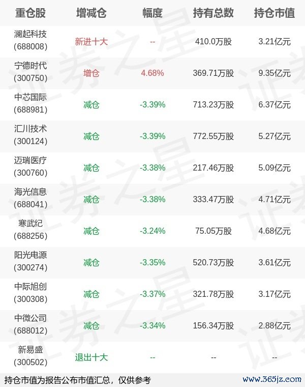 本站消息乐盈配资,4月22日易方达基金旗下成曦 伍臣东管理的易方达中证科创创业50交易型开放式指数基金公布一季报,近1年净值增长率15.2%。与上一季度相比,该基金前十大重仓股新增澜起科技;并对宁德时代增仓16.52万股,为该基金第一大重仓股;新易盛等退出前十大重仓股;详细数据如下: