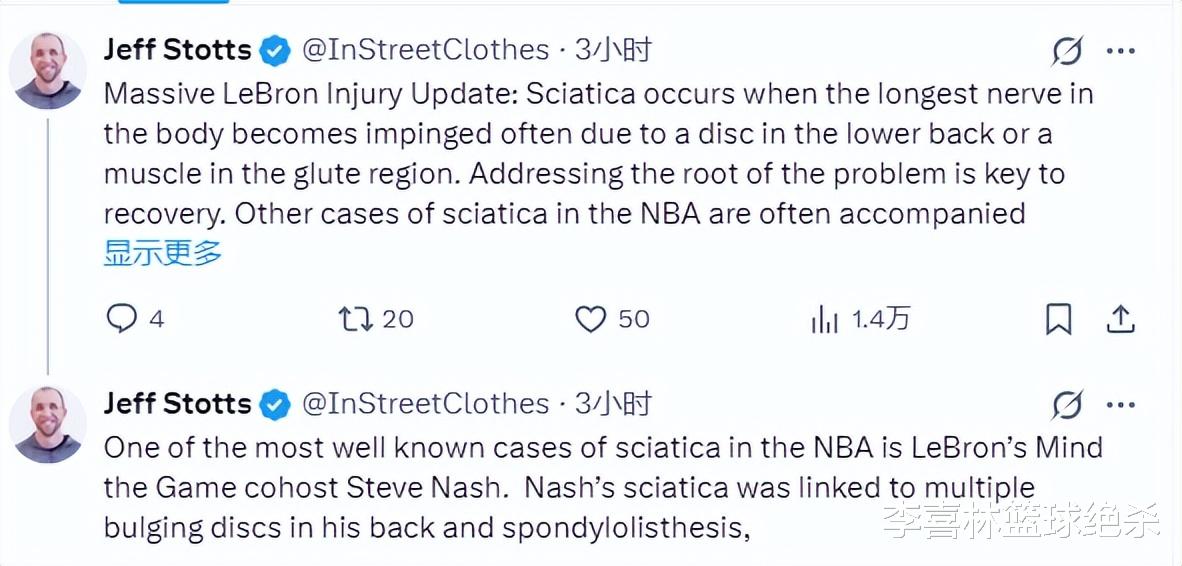 医学专家杰夫·斯托茨解析了詹姆斯的伤情,他在推特上写道:“勒布朗重伤更新:坐骨神经痛是指身体最长的神经受到压迫产生疼痛,通常是由于腰椎间盘或臀部肌肉受损所致。解决问题的根源是康复的关键。NBA中的其他坐骨神经痛的病例往往持续相当长的时间。”